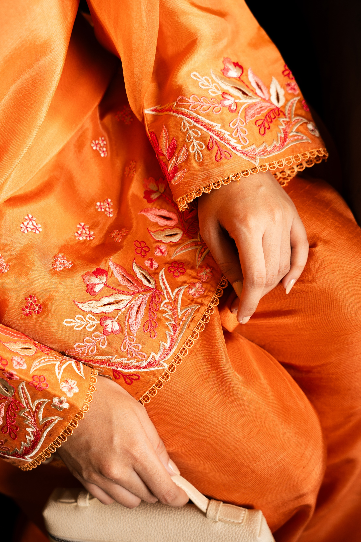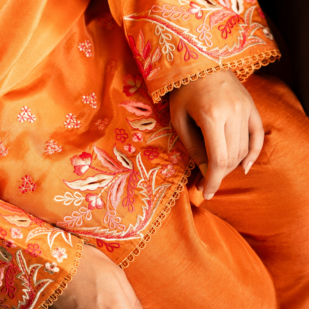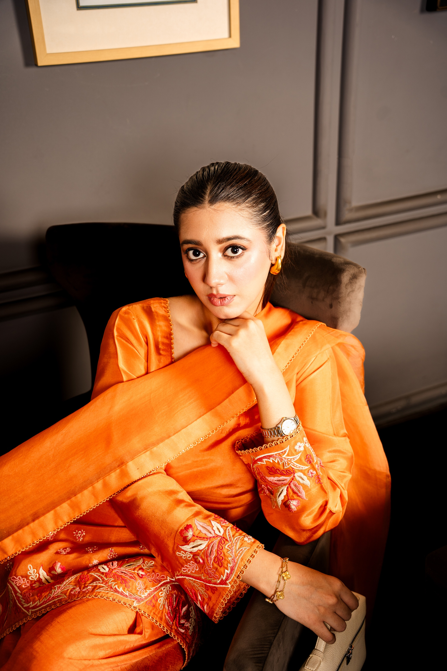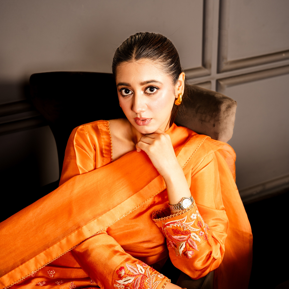 A celebration of heritage and heat, Gulnur blends traditional silhouette with vibrant cut work embroidery. The orange short shirt is paired with a farshi shalwar and statement dupatta—fiery, festive, unforgettable.