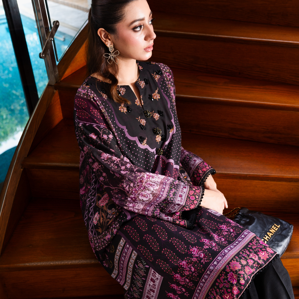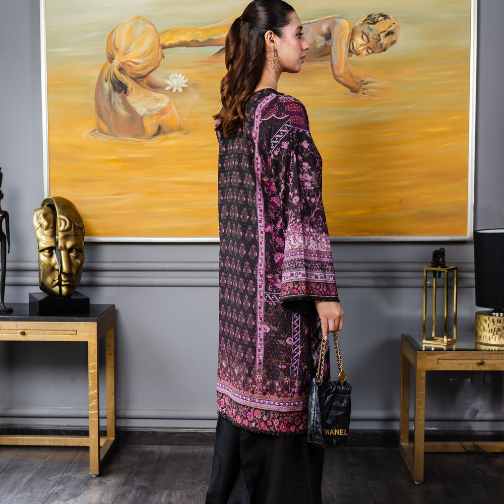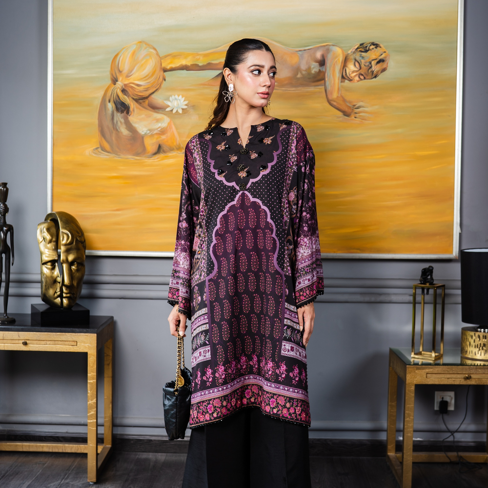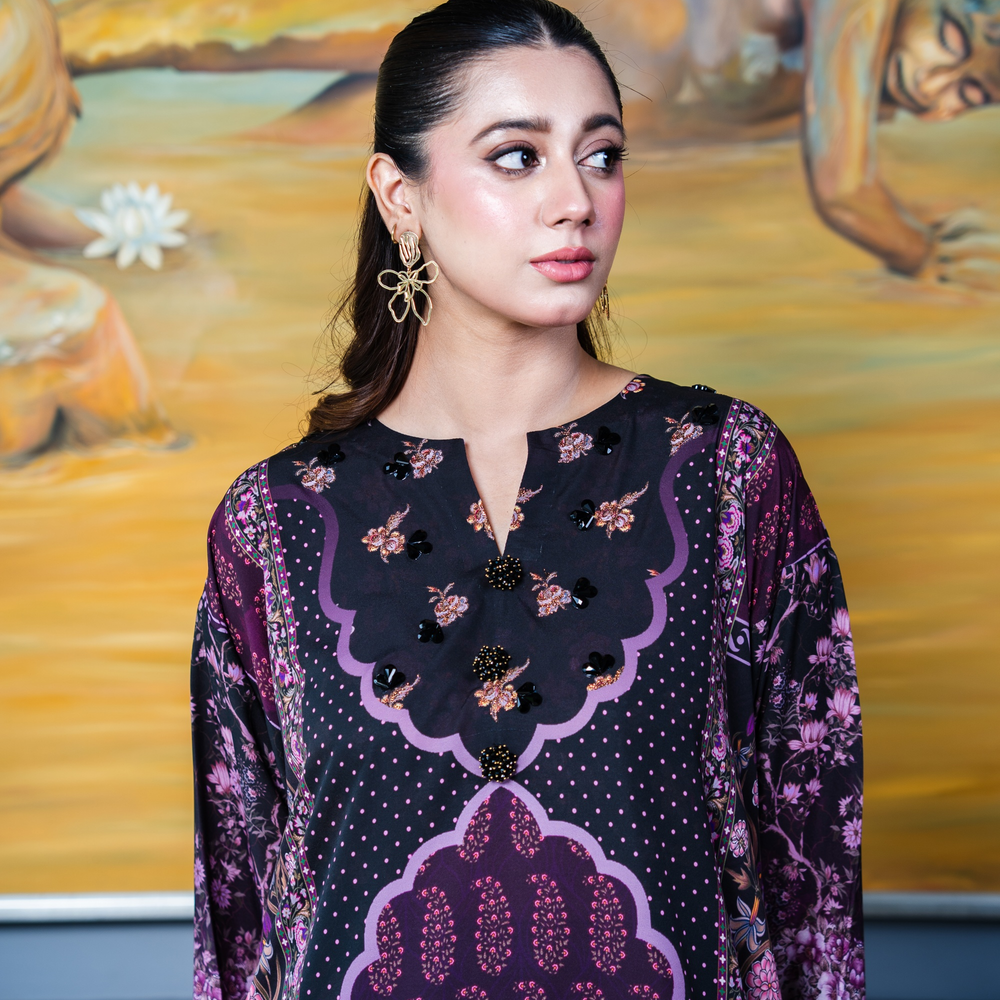 A classic silhouette elevated with print. Silk shirt in opulent tones of pinks and purples decorated with sublime crystal embellishment in the form of lace, buttons and beads.
