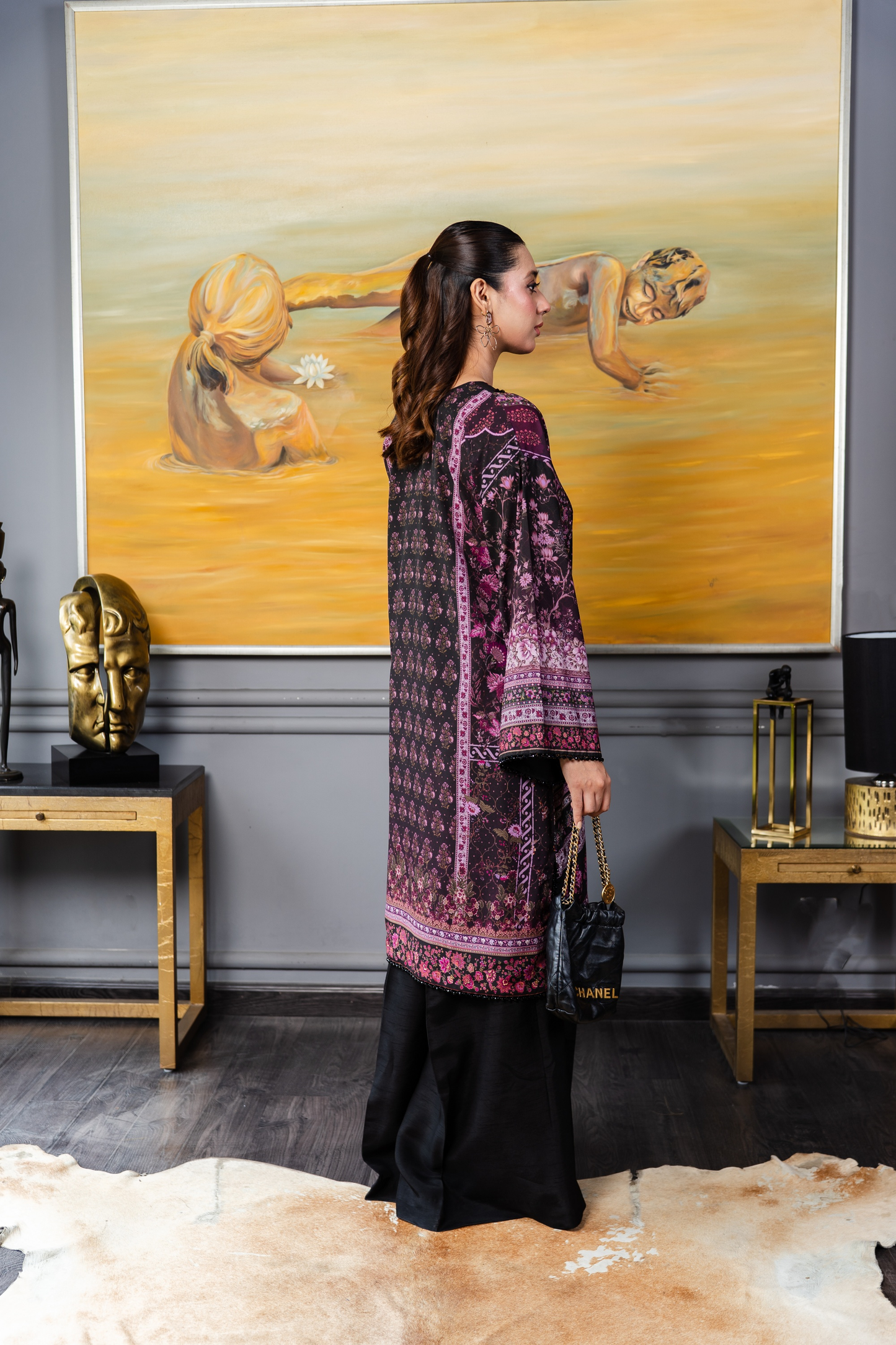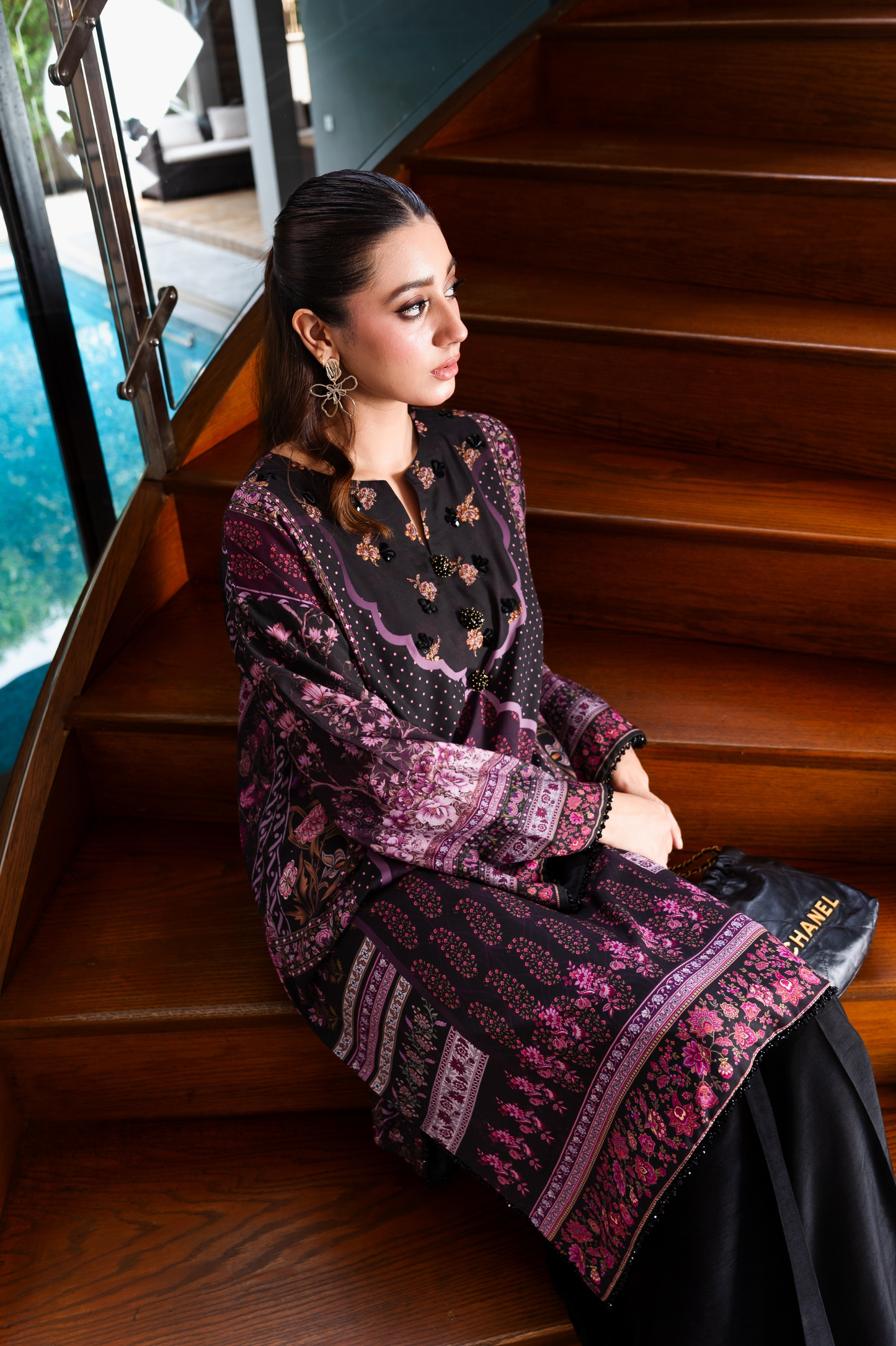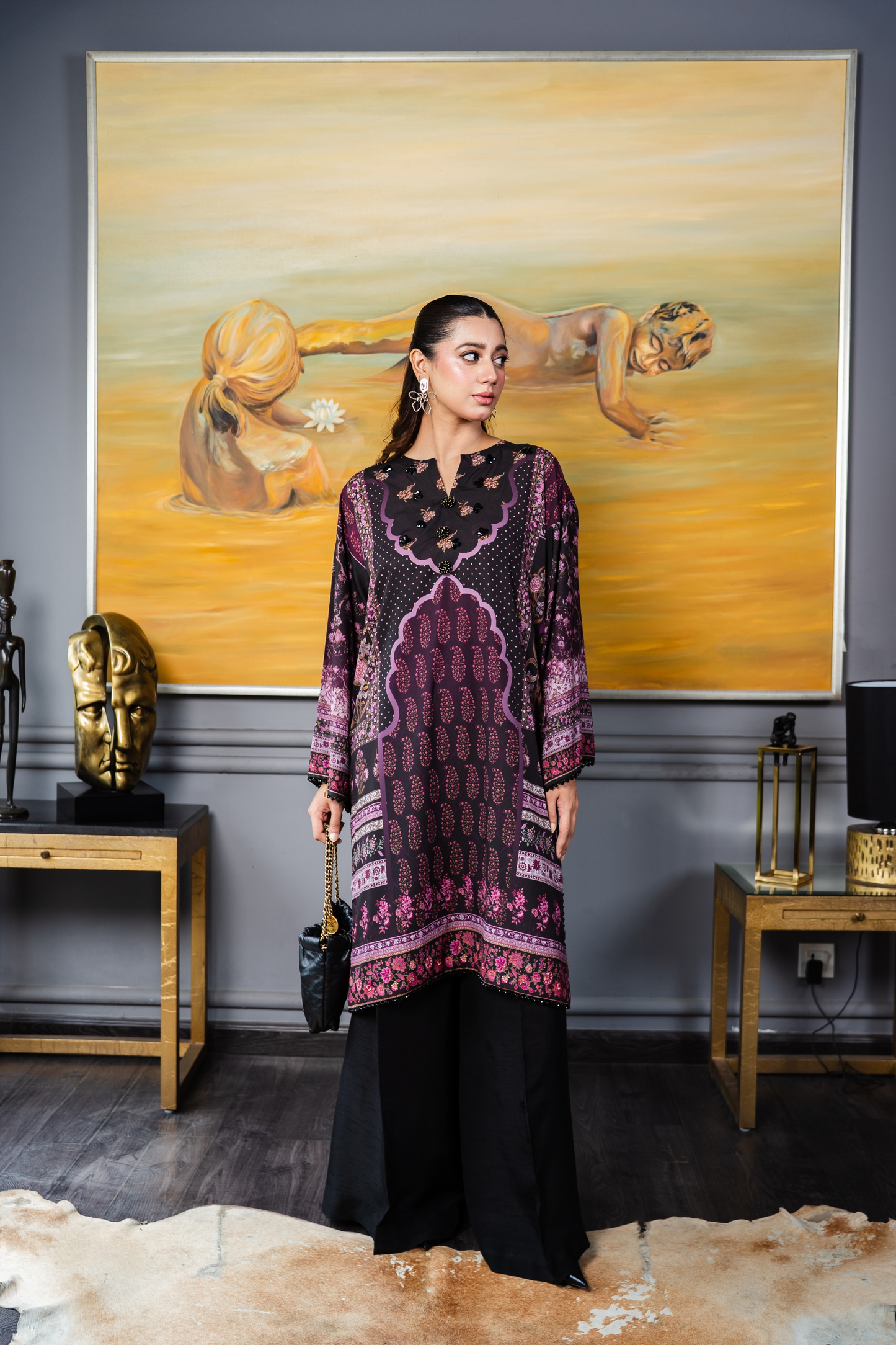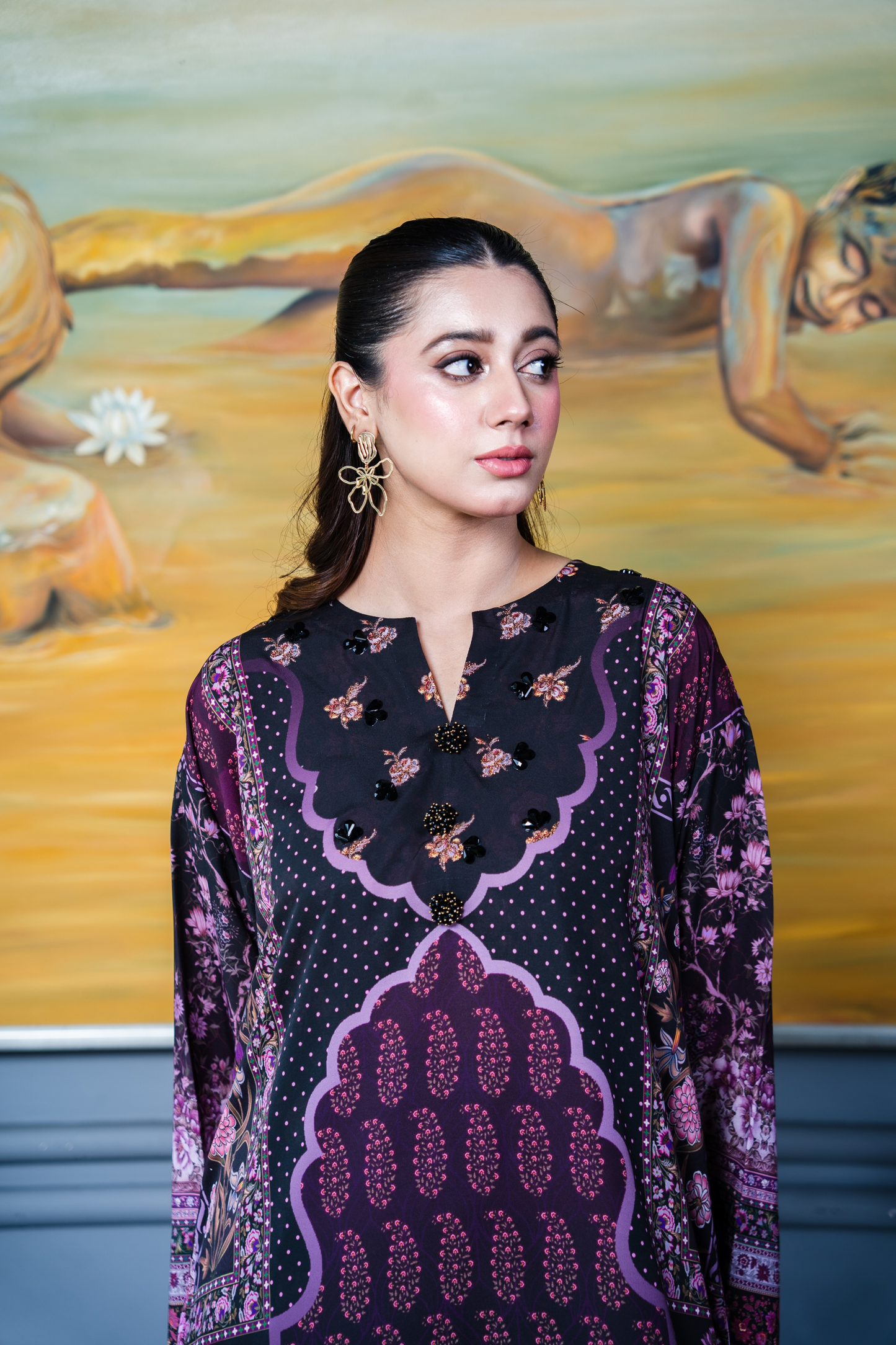 A classic silhouette elevated with print. Silk shirt in opulent tones of pinks and purples decorated with sublime crystal embellishment in the form of lace, buttons and beads.