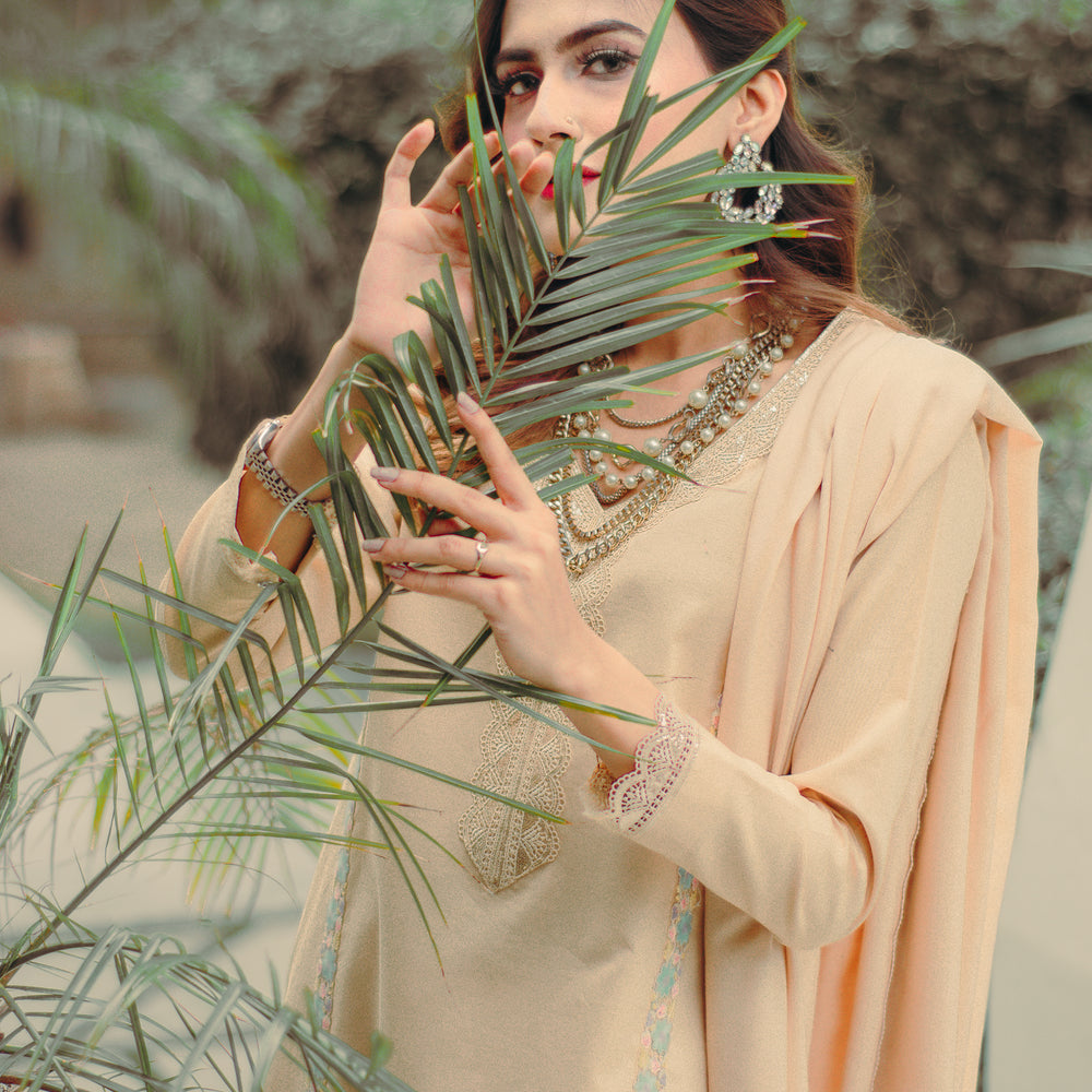 A traditional outfit comprising of a short shirt and shalwar come decorated with multi-coloured embroideries on the panels and “paancha” and further accentuated with sequined laces on the neckline, sleeves and dupatta.