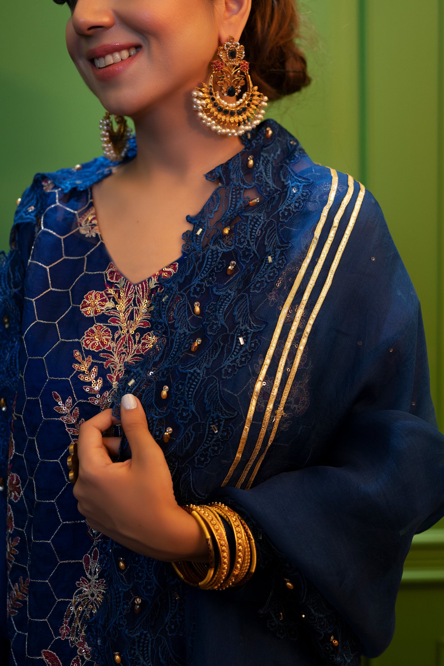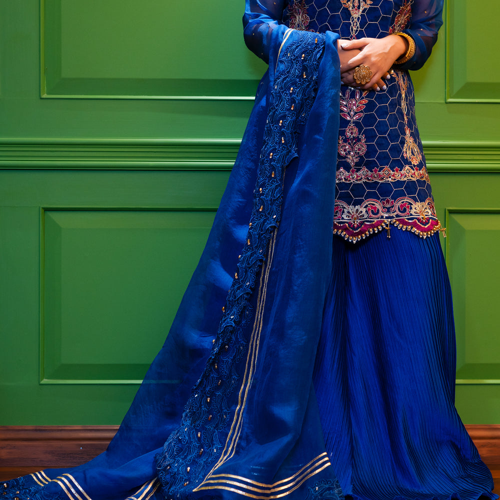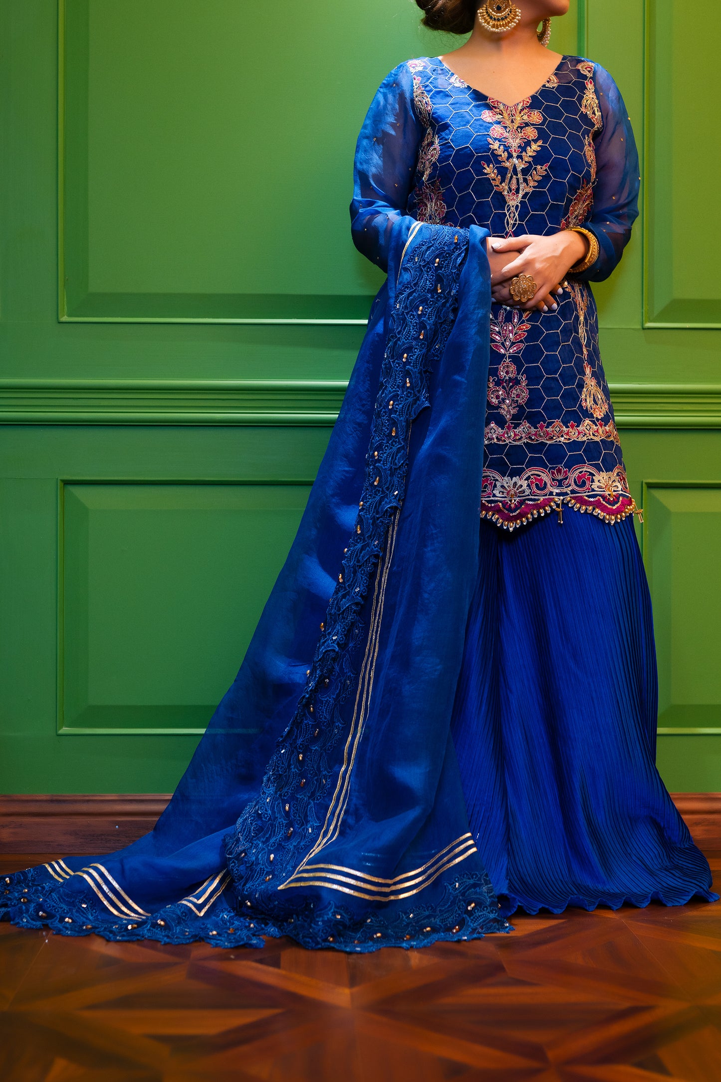 A modern take on the sharara shirt, this striking cobalt blue outfit comes with a heavily embroidered shirt and dupatta with a crushed silk sharara. Accents of gota and delicate hand embellishment sprinkled on the shirt elevate the style and make it a great choice for the wedding season. Step out in style and put a bold step forward.