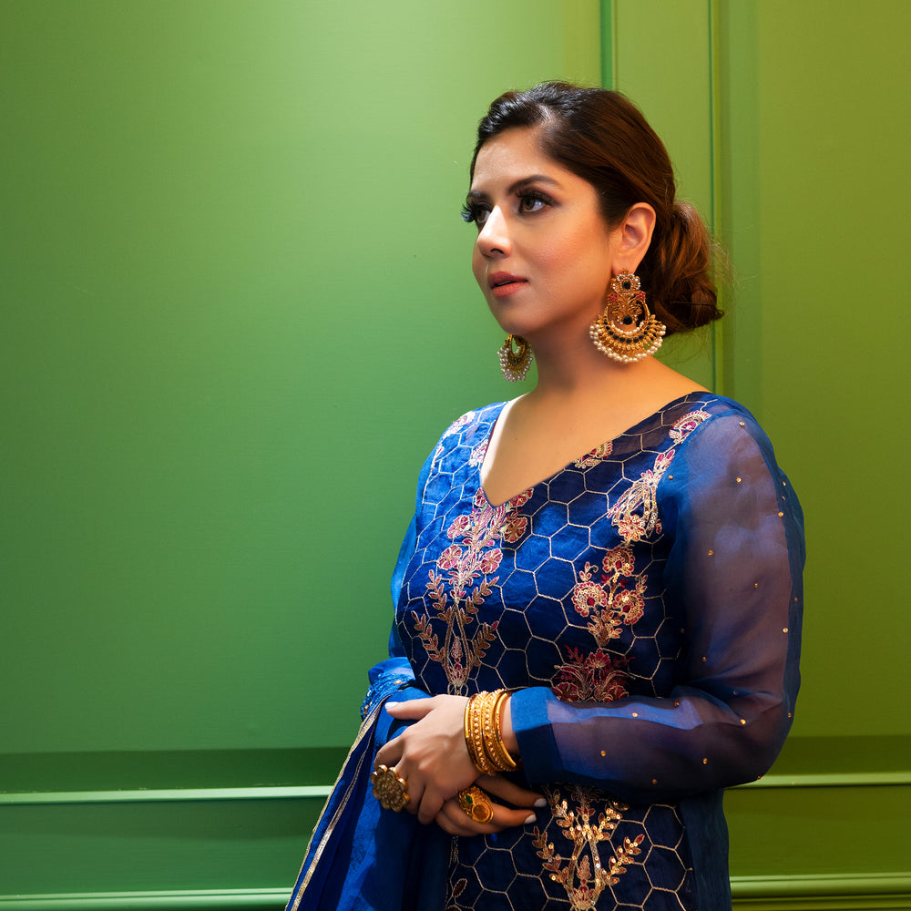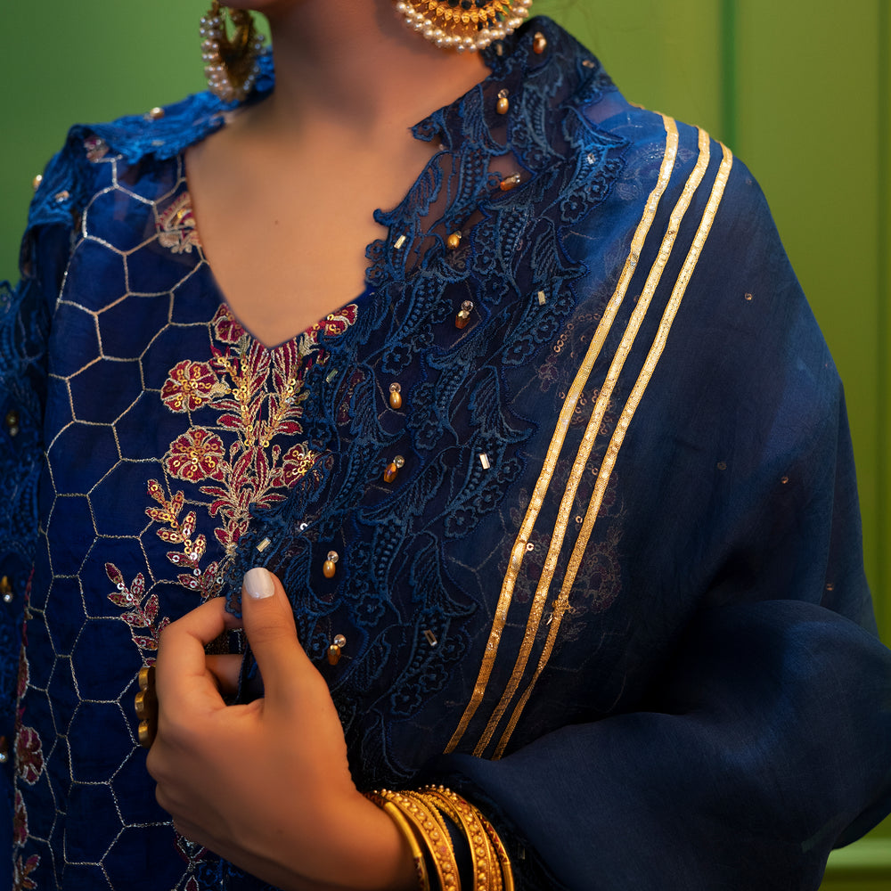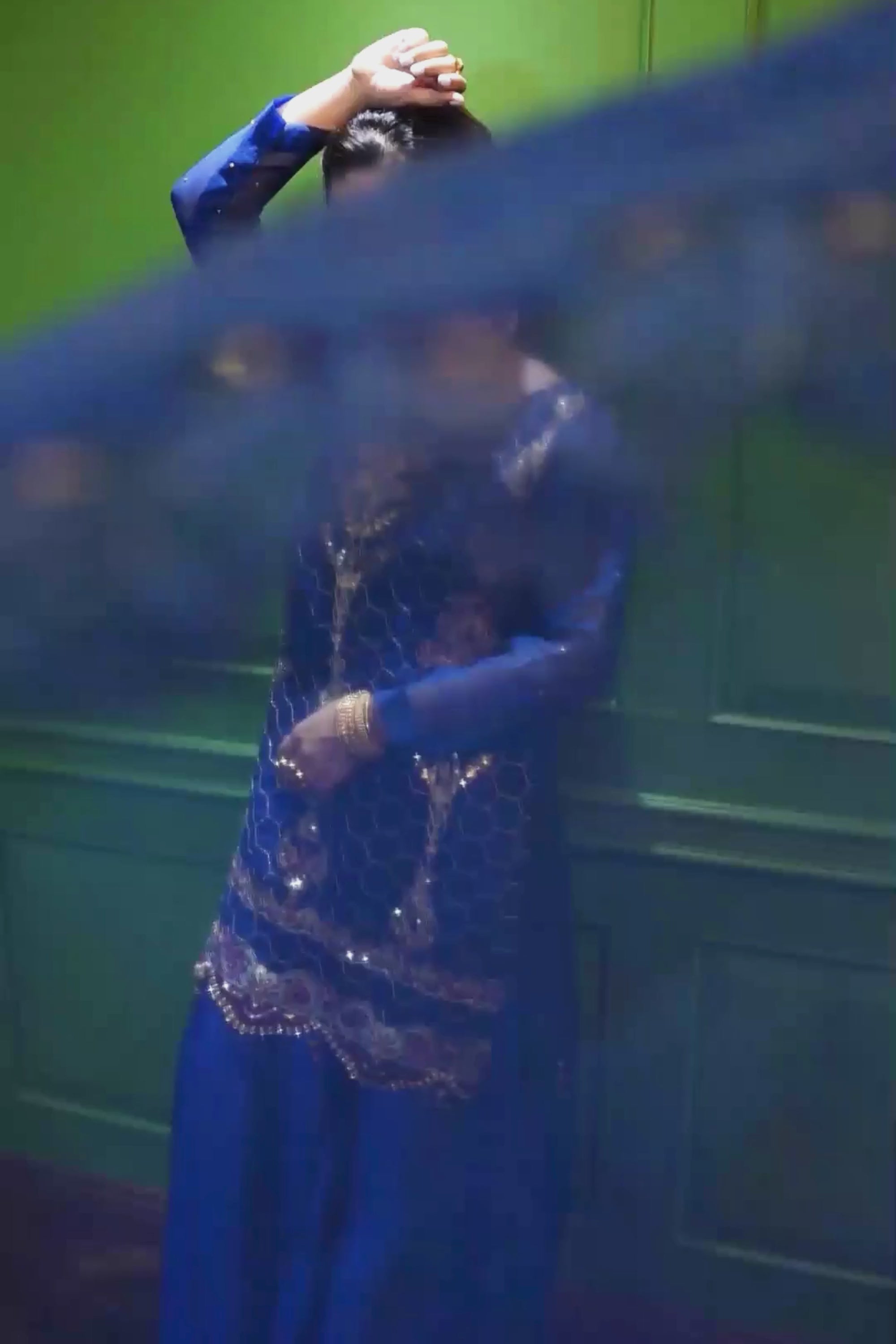 A modern take on the sharara shirt, this striking cobalt blue outfit comes with a heavily embroidered shirt and dupatta with a crushed silk sharara. Accents of gota and delicate hand embellishment sprinkled on the shirt elevate the style and make it a great choice for the wedding season. Step out in style and put a bold step forward.
